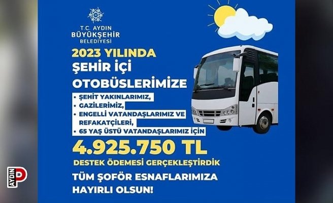 Aydın Büyükşehir Belediyesi tarafından yapılan açıklamada, “2023 yılında Aydın Şehir İçi Motorlu Taşıyıcılar Kooperatifi’ne, şehit yakınlarımız, gazilerimiz, engelli vatandaşlarımız ve refakatçileri, 65 yaş üstü vatandaşlarımız için 4 milyon 925 bin 750 TL destek ödemesi gerçekleştirdik. Tüm şoför esnaflarımıza hayırlı olsun” denildi.