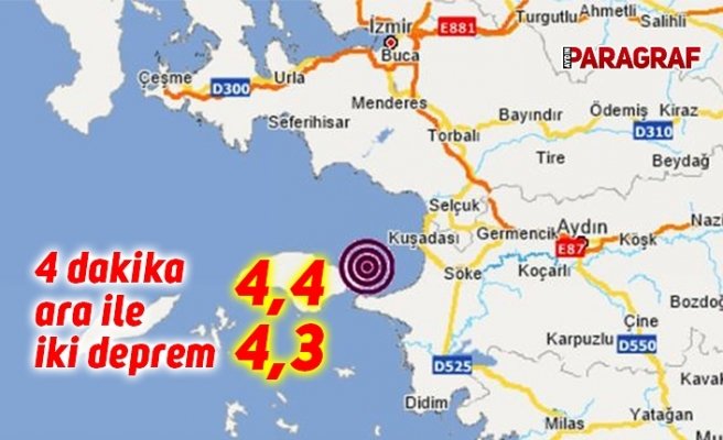 Aydın peş peşe sallandı. Merkez üssü Kuşadası Körfezi olan depremin birincisinin saat 14.14’de 4.4. şiddetinde olduğu, ikinci deprem ise saat 14,18’de 4.3. şiddetinde olduğu öğrenildi. Deprem, başta Kuşadası ve Efeler olmak üzere birçok ilçede hissedildi.