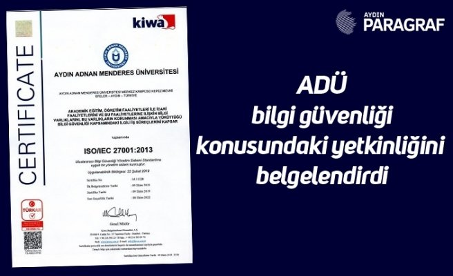 ADÜ Bilgi İşlem Daire Başkanlığının, 2019 yılı Şubat ayından itibaren sürdürdüğü çalışmalar sonucunda, uluslararası akreditasyonlu ve onaylı gözetim-denetim firması olan KIWA tarafından yapılan denetimlerde, yürüttüğü iş akış süreçlerinin ISO/IEC 27001 Bilgi Güvenliği Yönetim Sistemi Kalite Standardına uygunluğu belirlendi. ADÜ, bu uygunluk kapsamında Türk Akreditasyon Kurumu (TÜRKAK) onaylı “ISO/IEC 27001:2013 Bilgi Güvenliği Yönetim Sistemi” sertifikasını almaya hak kazandı.