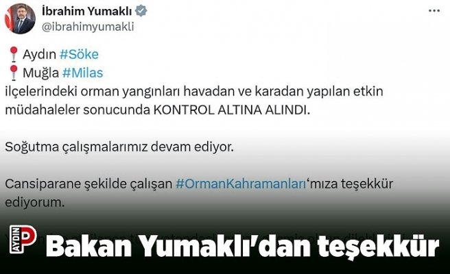 Bakan Yumaklı yaptığı paylaşımda, “Aydın’ın Söke ve Muğla’nın Milas ilçelerindeki orman yangınları havadan ve karadan yapılan etkin müdahaleler sonucunda kontrol altına alındı. Soğutma çalışmalarımız devam ediyor. Cansiparane şekilde çalışan #OrmanKahramanları‘mıza teşekkür ediyorum. Yangından etkilenen tüm vatandaşlarımıza geçmiş olsun dileklerimi iletiyorum” ifadelerini kullandı.