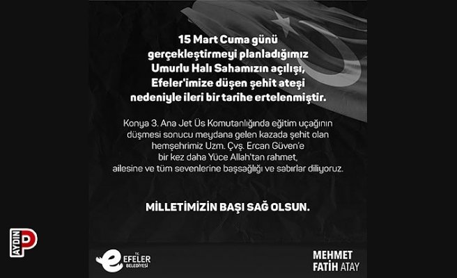 Başkan Atay şahsi sosyal medya hesaplarından yaptığı açıklamada açılışın ileri bir tarihe alındığını belirterek, “15 Mart Cuma günü gerçekleştirmeyi planladığımız Umurlu Halı Sahamızın açılışı, Efeler’imize düşen şehit ateşi nedeniyle ileri bir tarihe ertelenmiştir. Konya 3. Ana Jet Üs Komutanlığında eğitim uçağının düşmesi sonucu meydana gelen kazada şehit olan hemşehrimiz Uzm. Çvş. Ercan Güven’e bir kez daha Yüce Allah’tan rahmet, ailesine ve tüm sevenlerine başsağlığı ve sabırlar diliyoruz. Milletimizin başı sağ olsun.” ifadelerini kullandı.