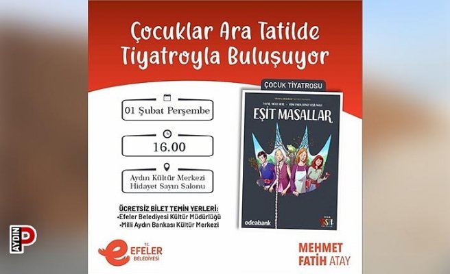 Başkan Atay, çocukların kültür sanata olan ilgilerini artırmak ve eğlenirken bilgilenecekleri bir gün yaşatmak için çocukları yarı yıl tatilinde tiyatro oyunu ile buluşturacak. Efeler Belediyesi bu kapsamda çocuk tiyatro oyunu ‘Eşit Masallar’a ev sahipliği yapacak. 1 Şubat Perşembe günü saat 16.00’da Aydın Kültür Merkezi Hidayet Sayın Salonu’nda sahnelenecek olan oyunun ücretsiz biletleri ise; Efeler Belediyesi Kültür Müdürlüğü ile Milli Aydın Bankası Kültür Merkezi’nden temin edilebilecek.