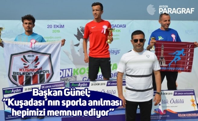 Başkan Ömer Günel, ödül töreni öncesi yaptığı konuşmasında “Gençlik ve Spor Bakanlığı ve Atletizm Federasyonu’nun destekleriyle bu yıl Aydın Büyükşehir Belediyesi tarafından ikincisi düzenlenen RunAydın Koşusu’na katıldığınız için sizlere ve destekleri için Büyükşehir Belediye Başkanımız Özlem Çerçioğlu’na çok teşekkür ediyorum. Kuşadası’nın en güzel mevsimi, en keyifli zamanları bunlar. Kuşadası’nın adının sporla anılmasından hepimizin çok memnun olduğuna eminim. Her yıl genişleyerek büyüyecek olan RunAydın’ımıza hepinizi önümüzdeki senelerde de bekliyorum” dedi. 5 kilometre koşusunu 44. olarak tamamladığını belirten Günel, “Ev sahibi olduğumuz için ayıp olmasın diye 1. gelmedim” dedi.