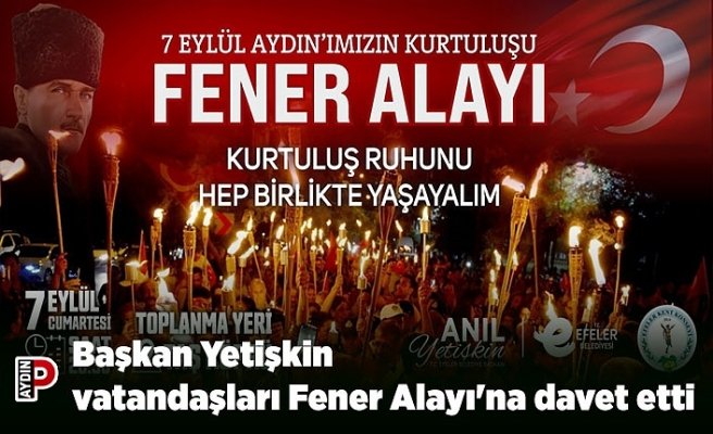 Başkan Yetişkin, etkinliğe ilişkin yaptığı açıklamada, “7 Eylül’ün, Aydın’ın özgürlüğü ve bağımsızlığı için verilen mücadelenin önemini hep birlikte hatırlayacağımız bir gün olmasını hedefliyoruz. Milli duygularımızı coşkuyla yaşamak ve geçmişimizi yâd etmek için Fener Alayı’na tüm vatandaşlarımızı bekliyoruz” dedi.