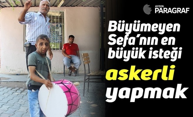 Aydın’ın Germencik ilçesinde çocuk görünümüne sahip olan 22 yaşındaki Sefa Tirit, 22 yılda sadece 11 kilo 400 gram ağırlığa ulaşabildi. En büyük tutkusu davul çalmak olan ve ilçenin maskotu haline gelen Sefa Tirit’in en büyük isteği askere gidip silahlı nöbet tutmak. Eve askerlik çağrı kağıdının yıllar önce geldiğini ancak büyüyemediği için kutsal görevi yapamadığını belirten Sefa Tirit, temsili olarak da olsa askerlik yapmak istiyor.