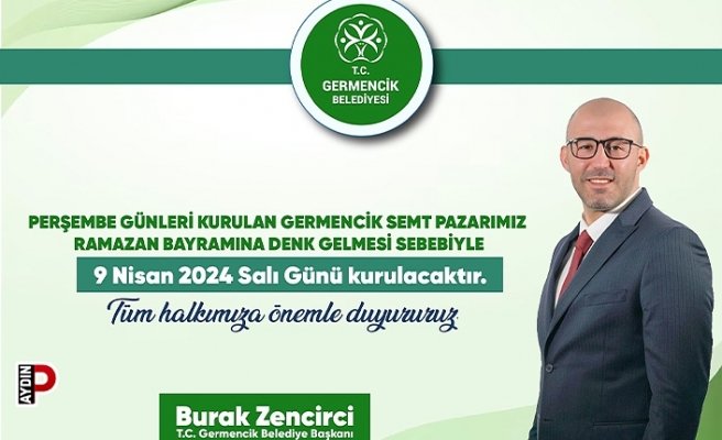 Germencik semt pazarı normalde haftanın Perşembe günleri yoğun bir ziyaretçi akınına uğrarken, Ramazan Bayramı öncesinde alışveriş yapmak isteyenler için 9 Nisan Salı günü kurulacak. Pazarda, bayramlık alışverişlerini yapmak isteyenler çeşitli ihtiyaçlarını karşılayabilecek.  Germencik Belediye Başkanı Burak Zencirci, vatandaşların rahat ve huzurlu bir bayram geçirmesi için gerekli tüm önlemlerin alındığını belirterek ‘iyi bayramlar’ dileğinde bulundu.