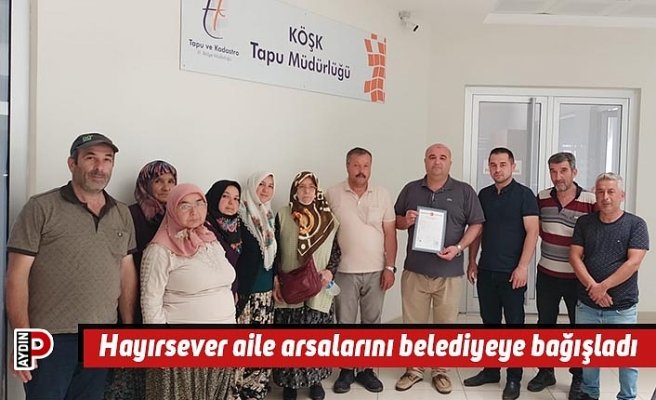 Aydın’ın Köşk ilçesinde hayırsever aile Gündoğan Mahallesi’nde bulunan arsalarını Köşk Belediyesi’ne bağışladı. Köşk Tapu Müdürlüğünde gerçekleşen törende Gündoğan Muhtarı Şuayip Çelik ile birlikte arsa sahipleri, arsa tapusunu Köşk Belediyesi İmar ve Şehircilik Müdürü Abdullah Caymaz ve Muhtarlık İşleri Müdürü Özgür Değer’e teslim etti.