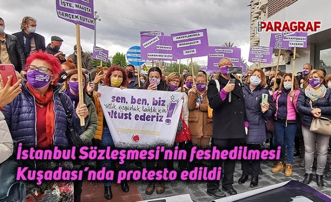 Aile içi ve kadına yönelik şiddetin önlenmesine ilişkin imzalanan İstanbul Sözleşmesi, dün gece saatlerinde Cumhurbaşkanlığı Kararnamesi’yle feshedilmesi tüm Türkiye’de olduğu gibi Kuşadası’nda da tepkiye neden oldu. Kuşadası Kadın Platformu tarafından düzenlenen protestoya siyasi partiler ile sivil toplum kuruluşlarının kadın temsilcileri destek verdi. Kaya Şavkay Meydanı’nda gerçekleşen protestoya ellerinde “İstanbul Sözleşmesi’nden Vazgeçmiyoruz” yazılı dövizlerle çok sayıda kadın ile CHP Kuşadası İlçe Başkanı Mehmet Gürbilek, Kadın Kolları Başkanı Ayşegül Dağlı, Gençlik Kolları Başkanı Simge Mıkıroğlu, ilçe yöneticileri, Kuşadası Belediye Başkan Yardımcısı Oğuzhan Turan ve Belediye Meclis Üyeleri katıldı.