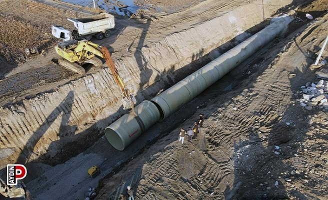 Aydın’ın Koçarlı ilçesinde 146 bin 40 dekar tarım arazisinin sulamasına hizmet verecek olan çalışmalarda bölgeye getirilen devasa boruların montajı aralıksız devam ediyor.