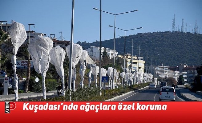 Kuşadası Belediyesi, hava sıcaklıklarının düşmesi nedeniyle kent genelinde ağaçları don ve kırağı örtüsü olan ‘agril’ ile kapladı. Gözenekli bir dokuya sahip olduğu için bitkilerin fotosentez yapmasına engel olmayan agril sayesinde Akdeniz iklimine alışkın ağaçlar kış boyunca olumsuz hava koşullarına karşı korunmuş olacak.