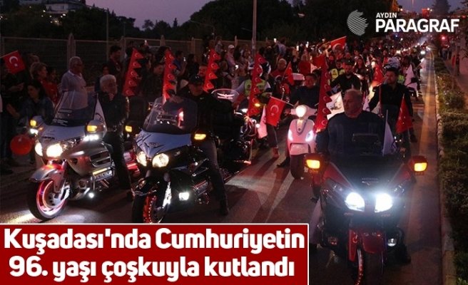 Kuşadası Belediyesi tarafından Cumhuriyet’in kuruluşunun 96’ıncı yılı nedeniyle düzenlenen korteje yaklaşık 15 bin kişi katıldı. Kısmet Otel Kavşağı’ndan saat 18:30’da başlayan yürüyüşe katılan vatandaşlar ellerinde Türk Bayrağı ve Atatürk posterleri taşıyarak Kuşadası Belediye Bandosu eşliğinde hep bir ağızdan marşlar söyledi. Atatürk Bulvarı üzerinden İsmail Cem Barış ve Dostluk Meydanı’na yürüyen korteje Kuşadası Belediye Başkanı Ömer Günel ailesi ile birlikte eşlik etti. Kortejin ön bölümünde yer alan 100 motosikletli yol kenarında dizilen vatandaş ve esnafdan büyük ilgi gördü. 2 kilo metrelik bir uzunluğa erişen kortejin yürüyüşünü tamamlaması yaklaşık 1 saat sürdü.