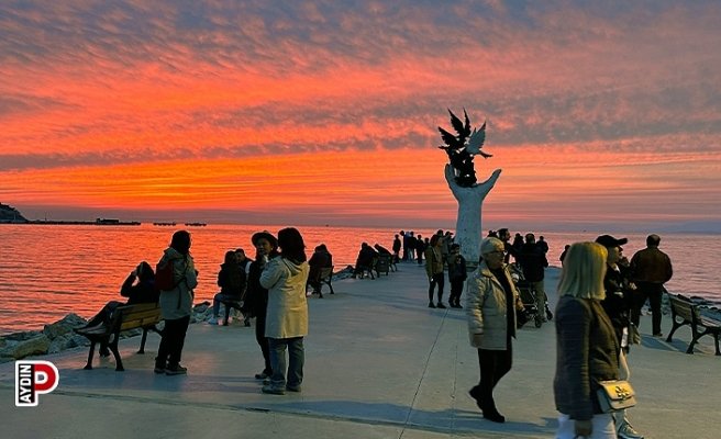 Kuşadası’nda gün batımında seyirlik görüntüler oluştu. İsmail Cem Barış ve dostluk meydanında bulunan el heykeli güneşin ufuk çizgisinde kayboluşu esnasında ortaya çıkan doğal kızıllık görenleri kendine hayran bıraktı. Güneşin Güvercinada Kalesi’nin arkasından batmasıyla birlikte gökyüzündeki bulutlar kırmızıya boyanırken, güneşten yansıyan ışıklar sahilde görsel bir şölen oluşturdu