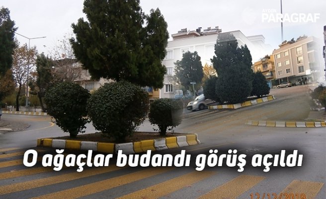 Aydın Efeler’de Lefkoşa Bulvarı ile Meşrutiyet Bulvarı’nın kesiştiği kavşakta bulunan ve sürücülerin görüş açılarını kapatan orta refüjdeki ağaçlar budamadan geçirildi.
