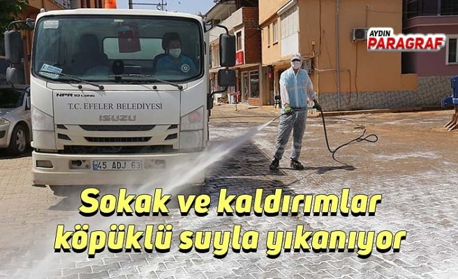 Sokak ve kaldırımlar köpüklü suyla yıkanıyor