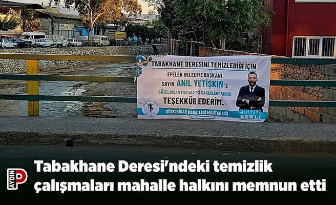 Temizlik çalışmalarının ardından Güzelhisar Mahalle Muhtarı Mustafa Benli bu memnuniyeti ifade etmek için dere çevresine bir teşekkür pankartı astı ve sosyal medya hesabından da paylaşımda bulundu. Pankartta, “Tabakhane Deresi’ni temizlediği için Efeler Belediye Başkanı Sayın Anıl Yetişkin’e mahalle sakinlerim adına teşekkür ederim” ifadesi yer aldı.