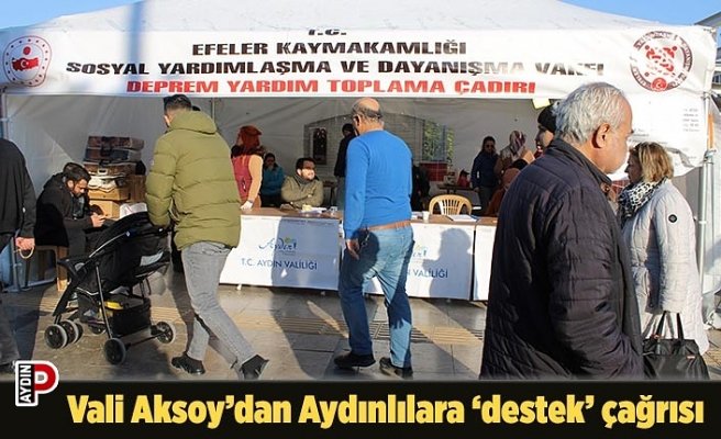 Konu ile ilgili sosyal medya üzerinden Aydın Vali Aksoy adına Aydın Valiliği’nden yapılan paylaşımda “Değerli hemşehrilerim, deprem bölgesine yönelik yardım kampanyamızın devam etmesi önem arz etmektedir. İlimizdeki tüm kurum ve kuruluşlarımız başta olmak üzere sivil toplum kuruluşlarımız ve halkımızla yardımlarımızı lütfen devam ettirelim. Özellikle ihtiyaç olan, gıda kolisi, yeni kıyafet, soba, ısıtıcı, iç çamaşırı, ayakkabı, bot, hijyen malzemeleridir gibi yardımlarınızı ilçelerimizde kaymakamlıklarımıza, ilimiz merkezinde ise Atatürk Kent Meydanı’na getirebilirsiniz” ifadeleri yer aldı.