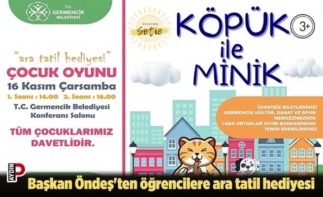 Öğrencileri tiyatroya davet eden Germencik Belediye Başkanı Fuat Öndeş, “Okullarımızın ara tatile girmesiyle birlikte çocuklarımızın verimli ve eğlenceli bir tatil geçirmeleri için tiyatro etkinliği düzenliyoruz. Çocuklarımıza tiyatroyu sevdirmeyi ve kültürel anlamda kendilerini geliştirmesine katkı sunacağına inanıyoruz. Çocuklarımız için düzenlediğimiz ücretsiz ‘Köpük ile Minik’ çocuk tiyatrosuna tüm öğrencilerimizi bekliyoruz” ifadelerini kullandı.