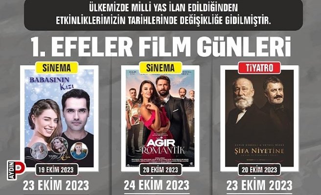 “Değerli Efeler Halkı; Cumhurbaşkanlığı Kararnamesi ile Milli Yas ilan edilmesi dolayısıyla Altan Erkekli Film Günleri’miz ertelenmiştir. 19 Ekim’deki filmler 23 Ekim Pazartesi günü saat 14.00 ve 16.00 seanslarında, 20 Ekim’deki filmler 24 Ekim Salı günü saat 16.00 ve 19.00 seanslarında yayınlanacaktır. 20 Ekim saat 20.00’de Pınarbaşı Mesire Alanı’mızda gerçekleştirmeyi planladığımız “Şifa Niyetine” adlı tiyatro oyunumuz ise 23 Ekim Pazartesi günü saat 20.00’ye ertelenmiştir. Önceki biletler geçerlidir”