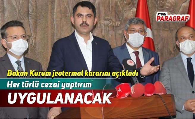 Koordinasyon toplantısında Aydın ile ilgili alınan kararları açıklayan Bakan Kurum; “Aydın jeotermal bakımından yüzde 70 jeotermale sahip bir şehir ve 36 jeotermal tesisi var. Aldığımız karar doğrultusunda bakanlığımızın mobil ölçüm cihazını Aydın’a gönderiyoruz. Artık Aydın Valiliği nezdinde görev yapacak olan bu cihazımızla birlikte tüm jeotermal tesislerinin hava kalitesini anlık izleyeceğiz. Tesislerin hava kirliliğini ölçmek üzere hava kalitesi ölçüm cihazlarını takma zorunluluğunu getireceğiz ve tüm tesisler bu cihazları yıl sonuna kadar takmış olacak. Aynı zamanda bölgede istihdamı için projeler yürüteceğiz. Jeotermalden faydalanarak Aydın’ın ısınma ve tarımda kullanılması amacıyla çalışma yapacağız. Vatandaşlarımızın içi rahat olsun. Hava kirliliği olan tesisler için kapatma işlemleri de dahil her türlü yaptırımı uygulayacağız” dedi.