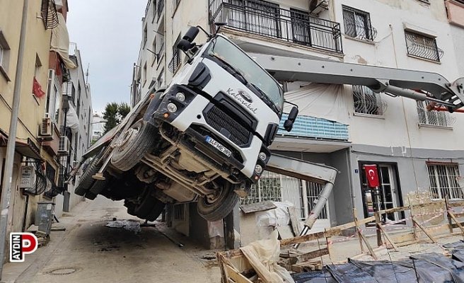 Aydın’ın Kuşadası ilçesinde, inşaat çalışması sırasında beton dökme aracı, sabitleme ayaklarından 3’ü açılmayınca yan yatarak şaha kalktı. İnşaat temeli ile yol arasında askıda kalan aracın 20 metrelik kolunun bir kısmı da yan tarafta bulunan bir apartmana zarar verdi.