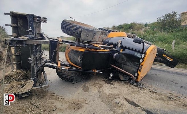 Aydın’ın Kuşadası ilçesinde, özel bir firmaya ait iş makinesi frenlerinin boşalması sonucu devrildi.
