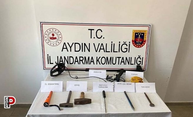 Aydın İl Jandarma Komutanlığı görev ve sorumluluk alanlarında bulunan bölgelerde vatandaşların huzur ve güvenliğini sağlamak için çalışmalarını 7-24 esasına dayalı olarak sürdürüyor. Edinilen bilgiye göre, Dereağzı Mahallesi’nde gece saatlerinde el feneri ile arazide dolaşan 3 şahıs devriye ekibi tarafından tespit edilerek yakalandı. Şahısların kullanmış olduğu aracın arka koltuğunda görünür vaziyette 2 adet dedektör ve muhtelif kazı malzemeleri ele geçirildi. Tarihi eser aramak amacıyla kaçak kazı yapacakları değerlendirilen A.Y., U.B. ve S.B. isimli şahıslar gözaltına alındı.