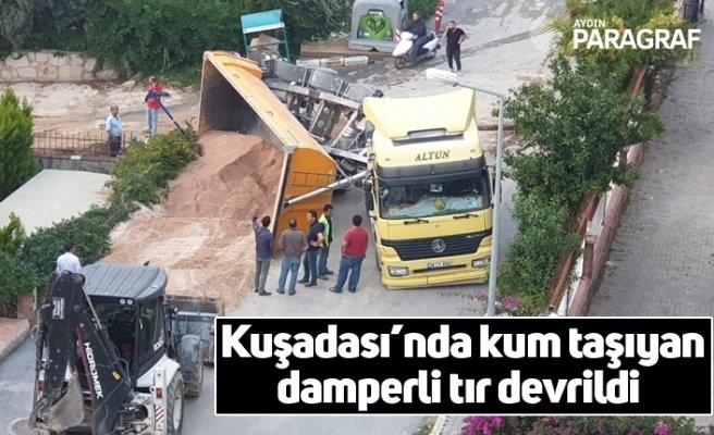 Kuşadası’nda bir inşaata kum taşıyan damperli tır, sürücüsünün direksiyon hakimiyetini kaybetmesi sonucu devrildi.