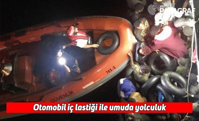Kuşadası Körfezi’nde yasa dışı yollardan yurt dışına kaçmaya çalışan bir grup kaçak göçmen güzergahı şaşırınca cankurtaran yeleği yerine kendilerine verilen otomobil iç lastiği şambreller ile denizin ortasında mahsur kaldı.