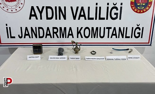 Aydın İl Jandarma Komutanlığı, KOM Şube Müdürlüğü ekiplerince, yol emniyeti ve kontrolü esnasında durdurulan bir araç içesinde yolculuk yapan bir şüpheli şahsın üzerinde yapılan üst aramasında, bir adet 12 cm uzunluğunda ibrik, bir adet 6 cm uzunluğunda fotoğraf, bir adet 12 cm uzunluğunda sfenks heykeli, bir adet yüzük, bir adet 7×7 ebatlarında saat ele geçirildi. Tarihi eser değeri olduğu değerlendirilen malzemeler incelenmek üzere Müze Müdürlüğü’ne teslim edilirken, olayla ilgili adli sürecin devam ettiği öğrenildi.